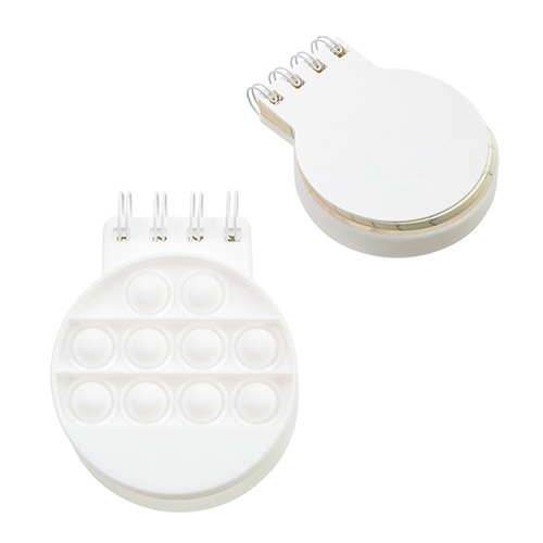 - Round-shaped spiral notebook with built-in push pop fidget cover