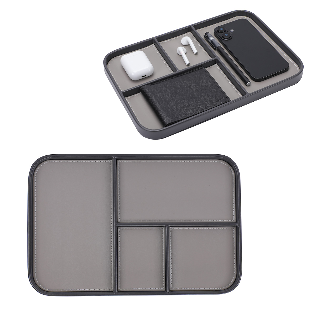- Multi-compartment valet tray organizes phone, wallet, earbuds, keys, and daily essentials