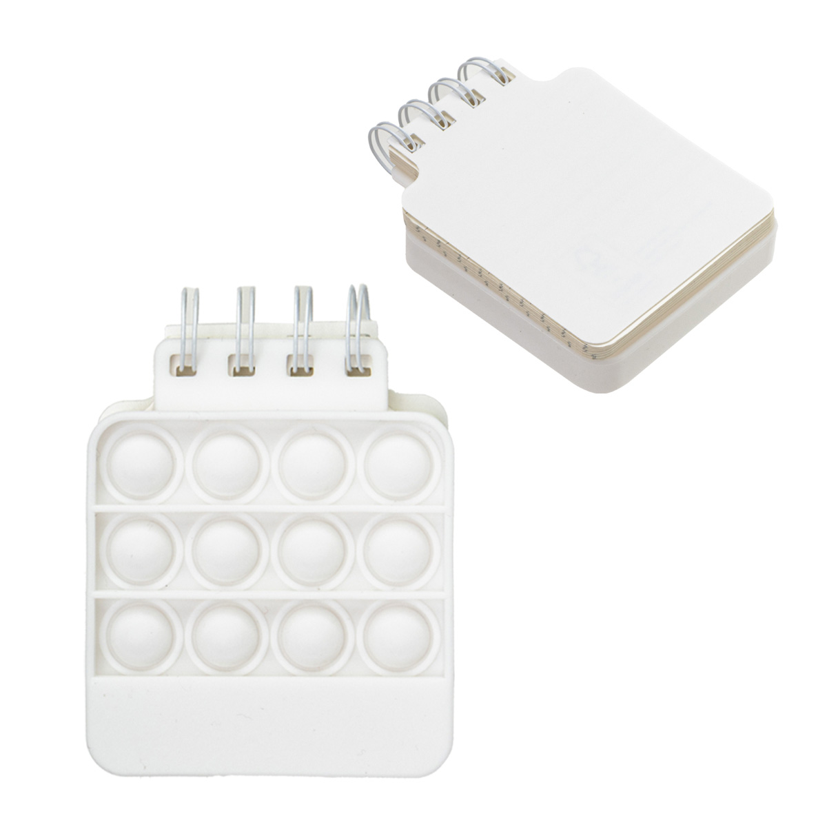 - Square-shaped spiral notebook with built-in push pop fidget cover