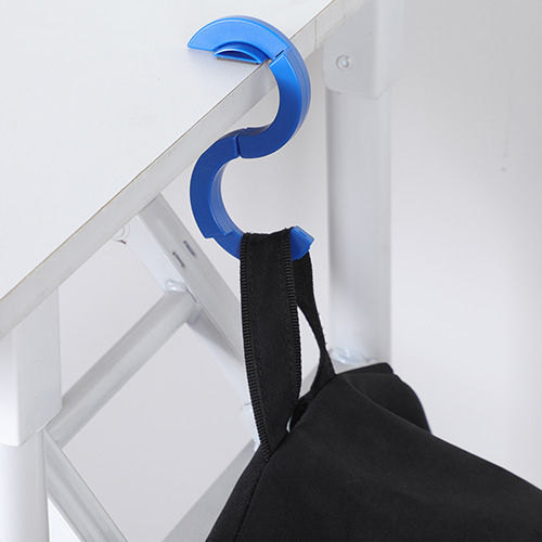 - Functions as both a desk edge hook and portable bag hanger
