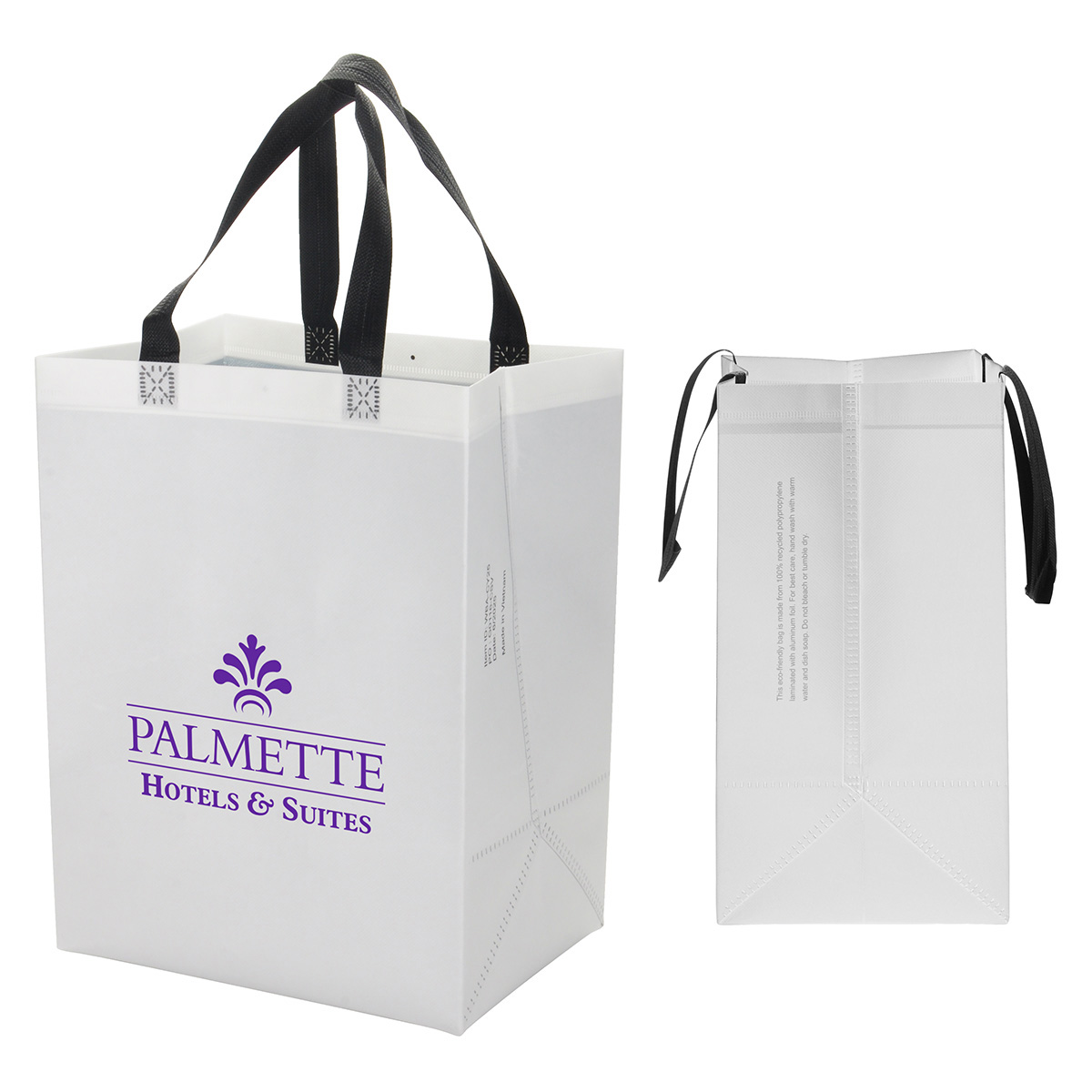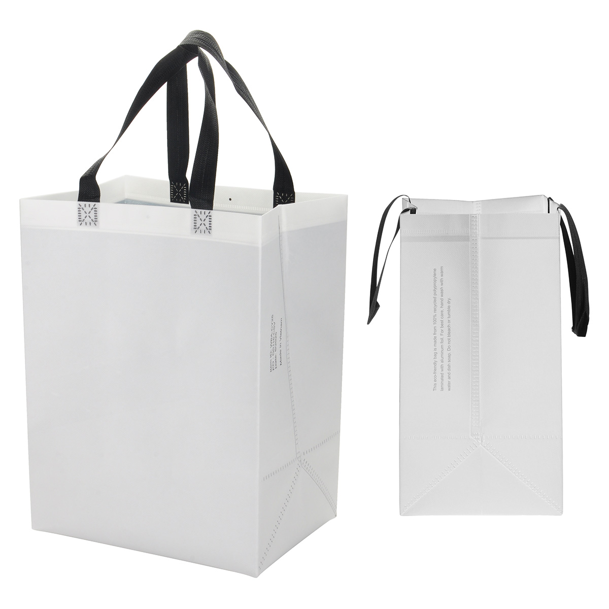 - Crafted from 100% recycled 75GSM polypropylene non-woven fabric laminated with aluminum foil