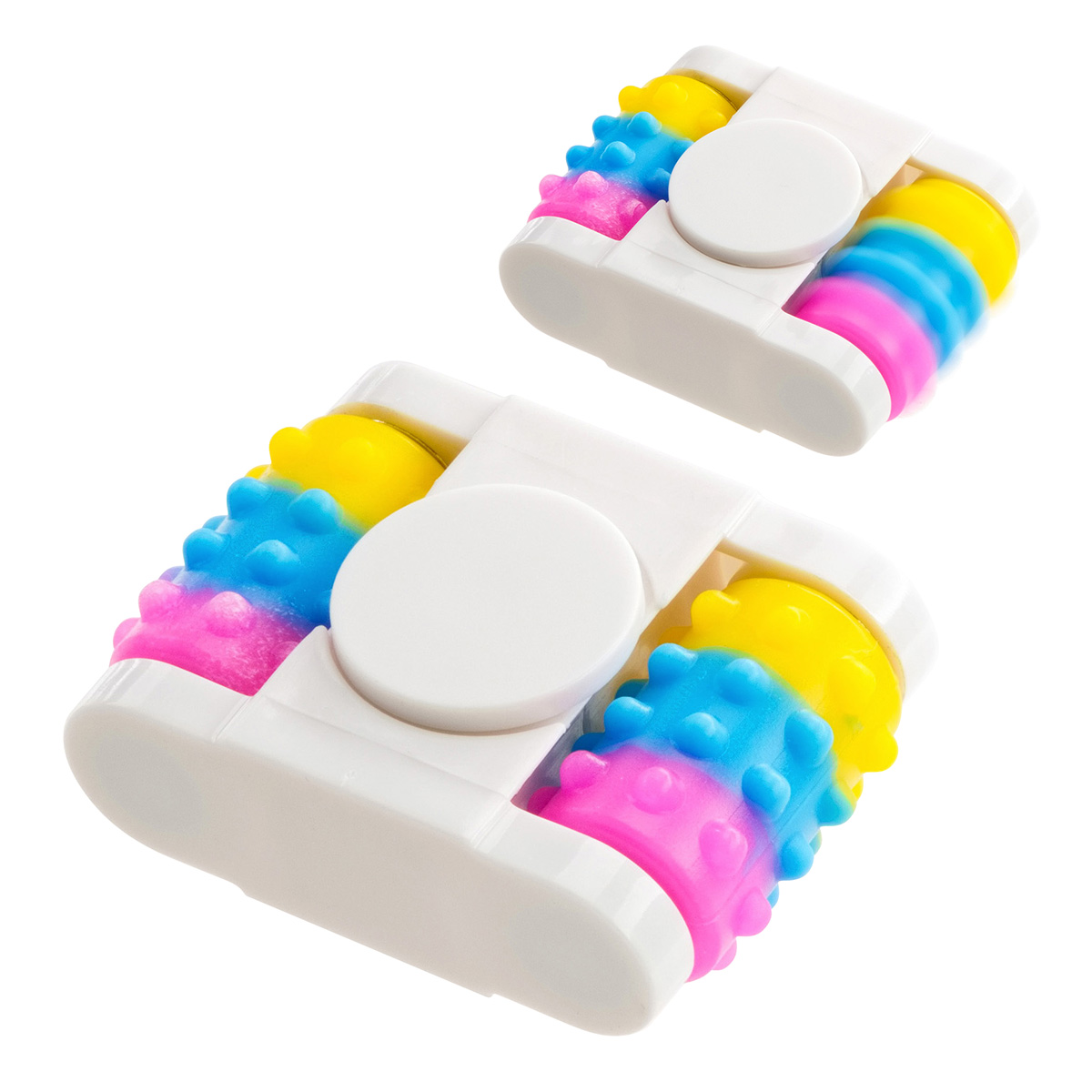 - Dual-function stress reliever combines a massage roller with a smooth-spinning fidget center