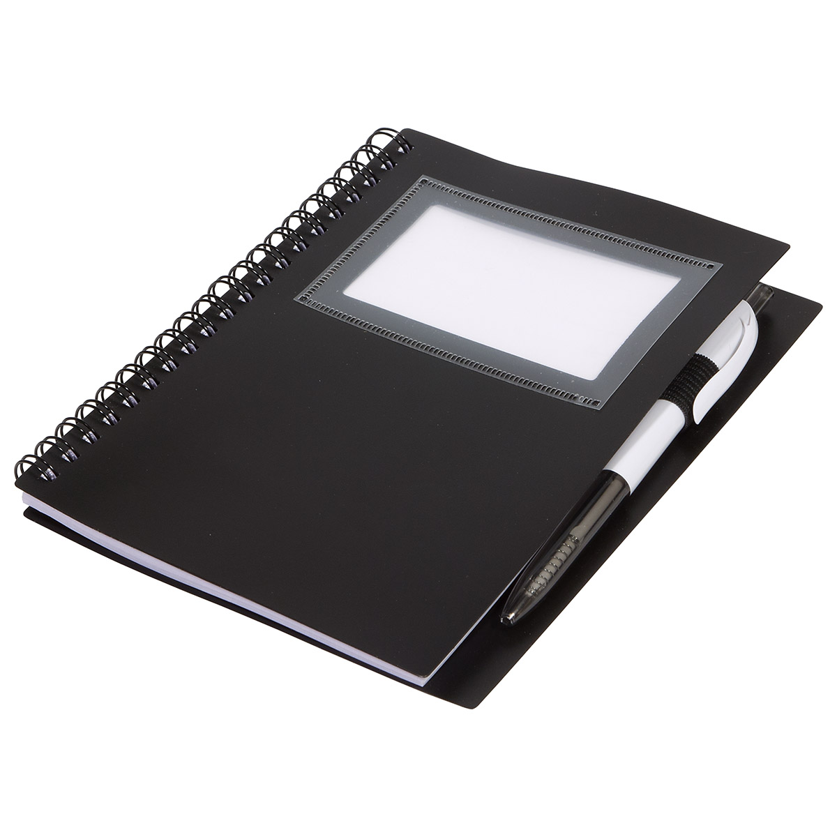 - Color matched point pen, with black ink, is inserted in elastic loop