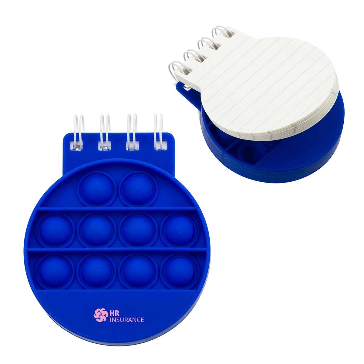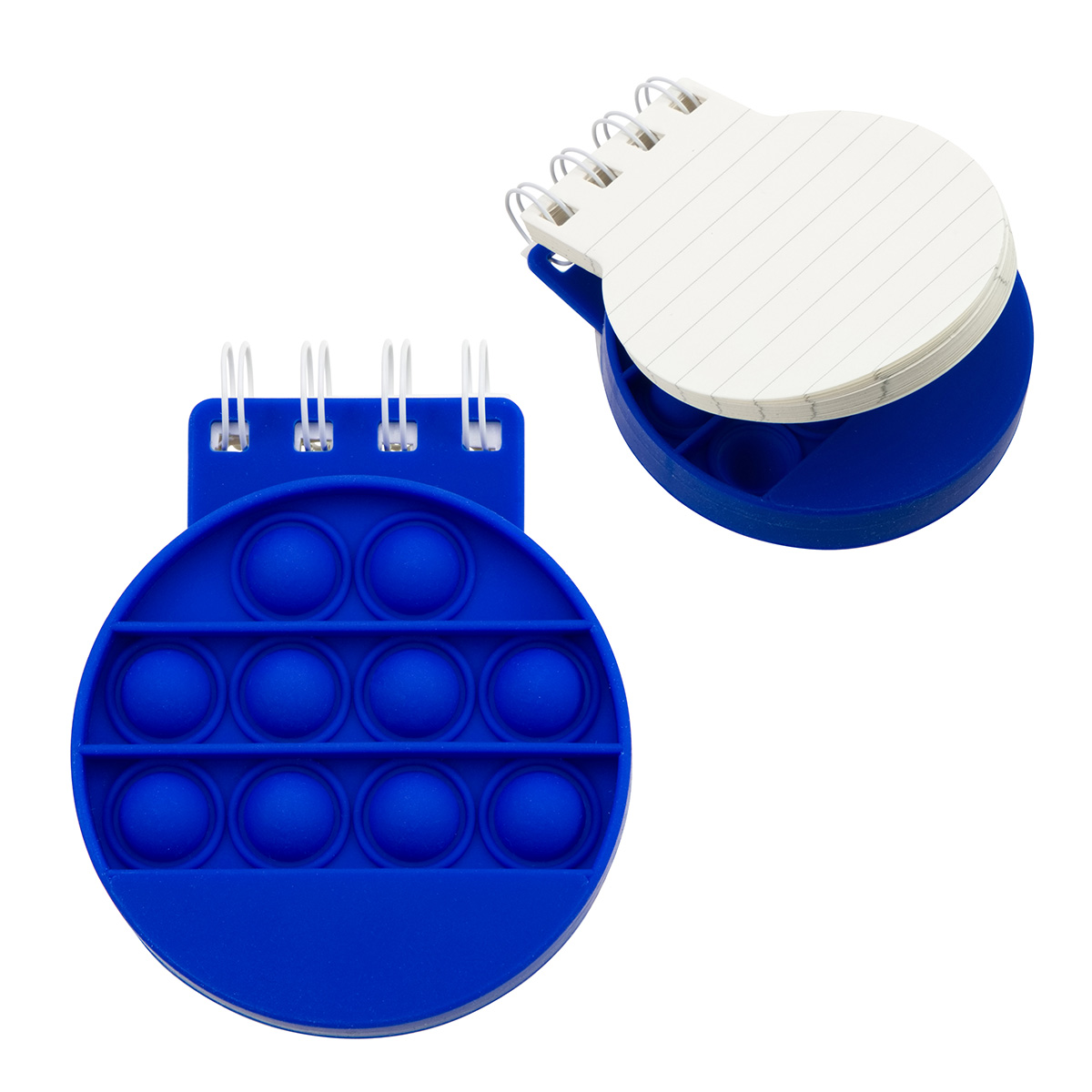 - Round-shaped spiral notebook with built-in push pop fidget cover