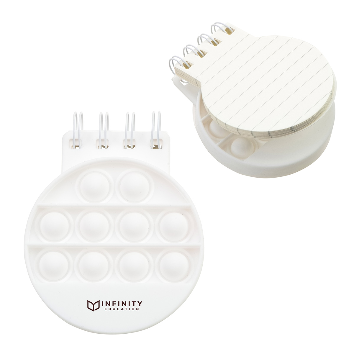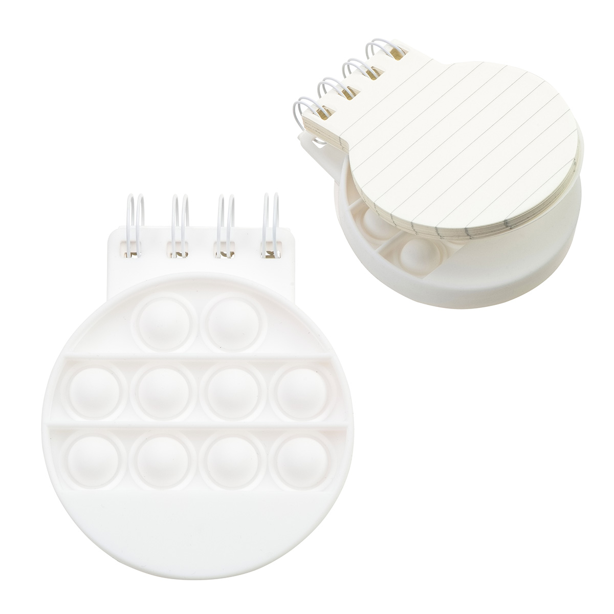- Round-shaped spiral notebook with built-in push pop fidget cover