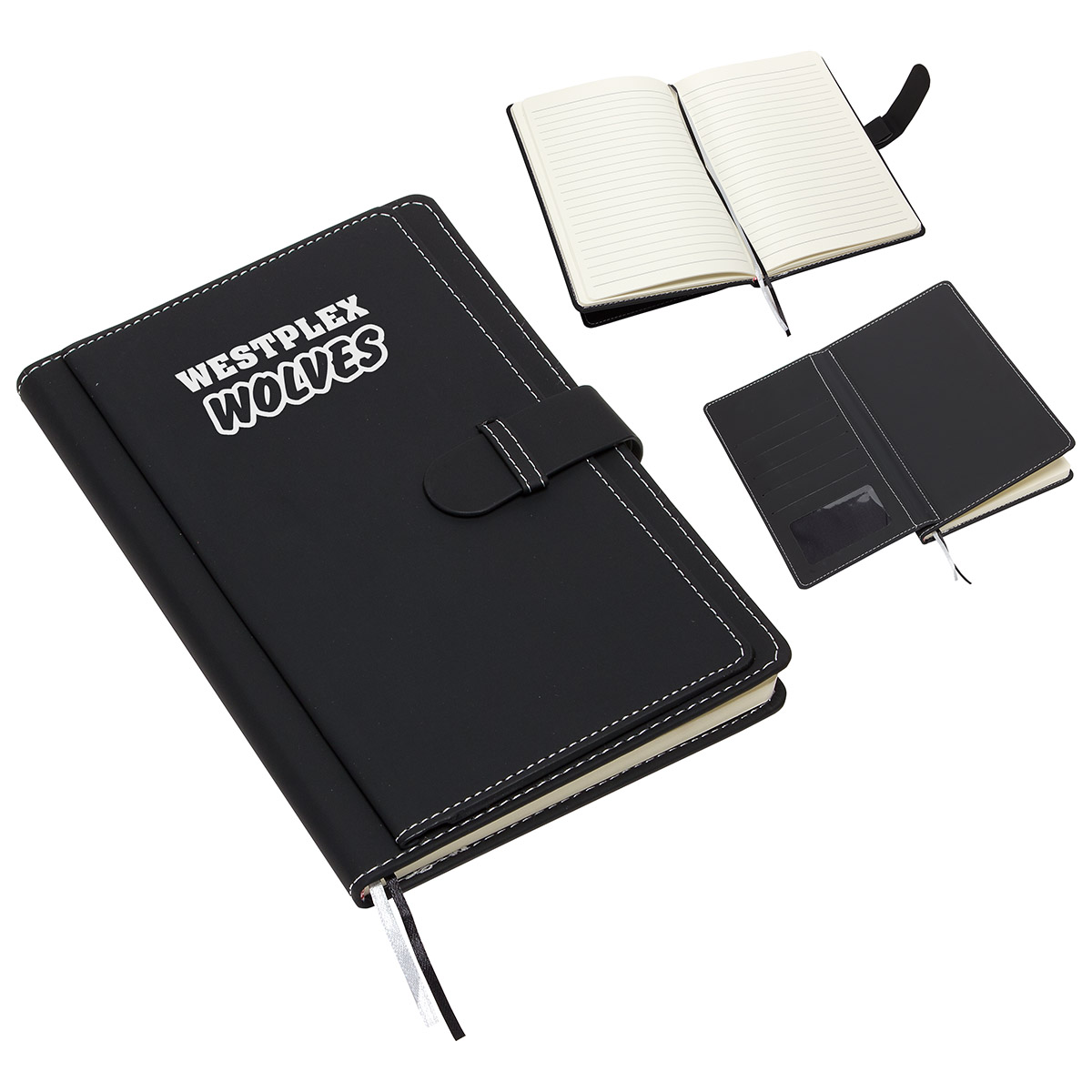 - Features a double front cover with large pocket and five card pockets, one with clear window