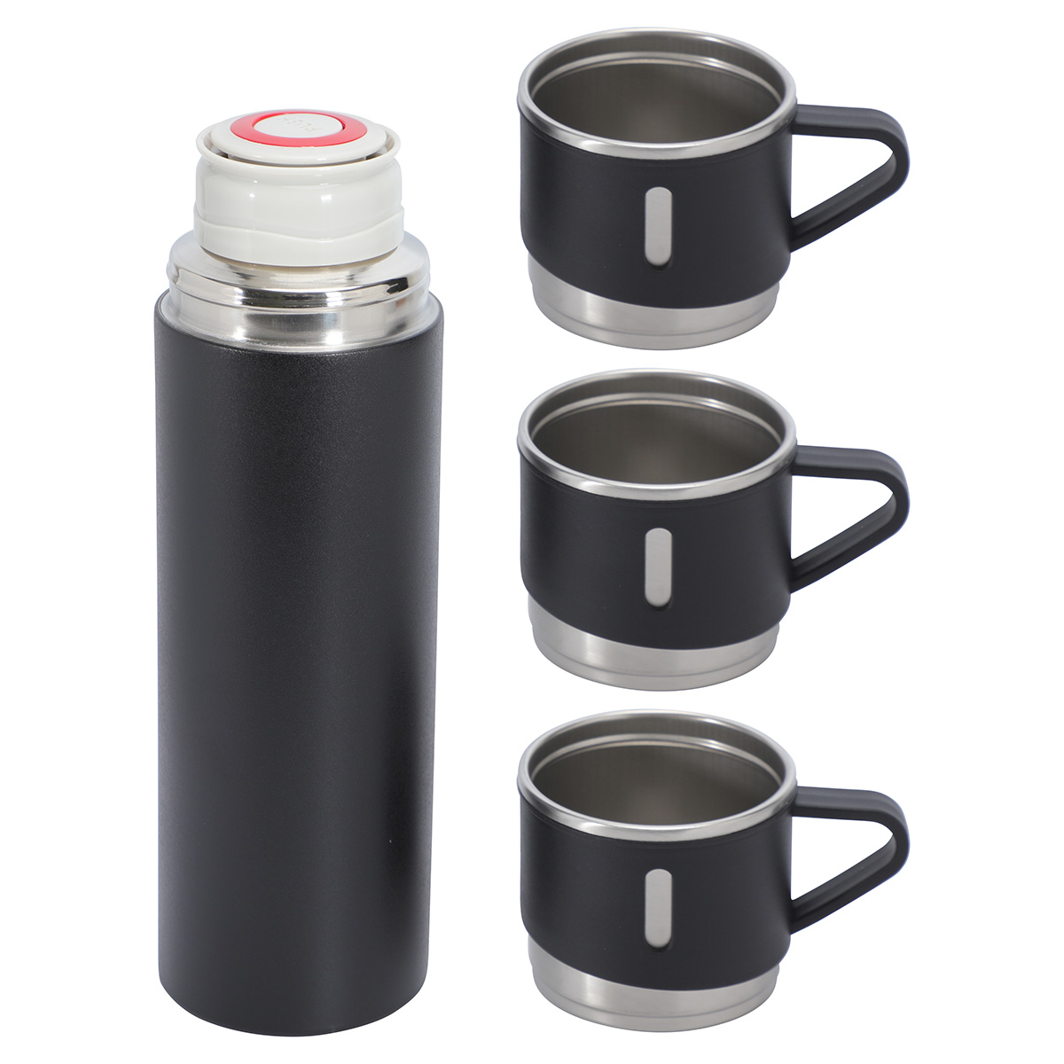 - Comes with three 5 oz matching stainless steel mugs