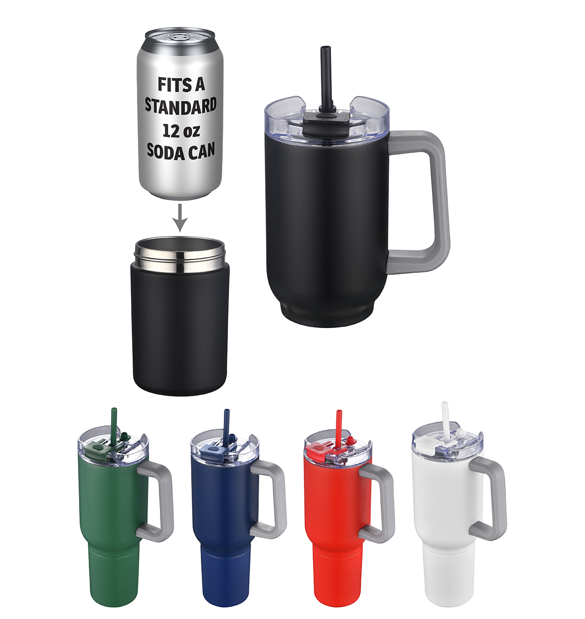 - Dual-purpose design: 20 oz vacuum insulated travel mug with handle and straw plus 12 oz screw-off bottom for use as a can cooler or a snack container