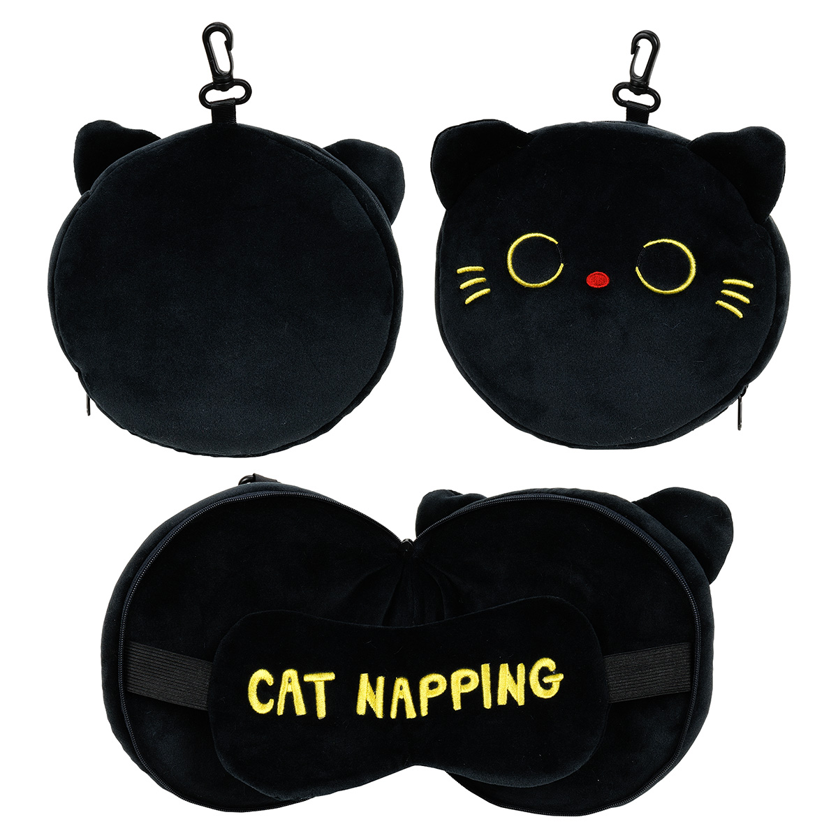 - Plush, polyester pillow is shaped as a black cat on the outside with a matching eye mask inside with yellow embroidered phrase, "CAT NAPPING"