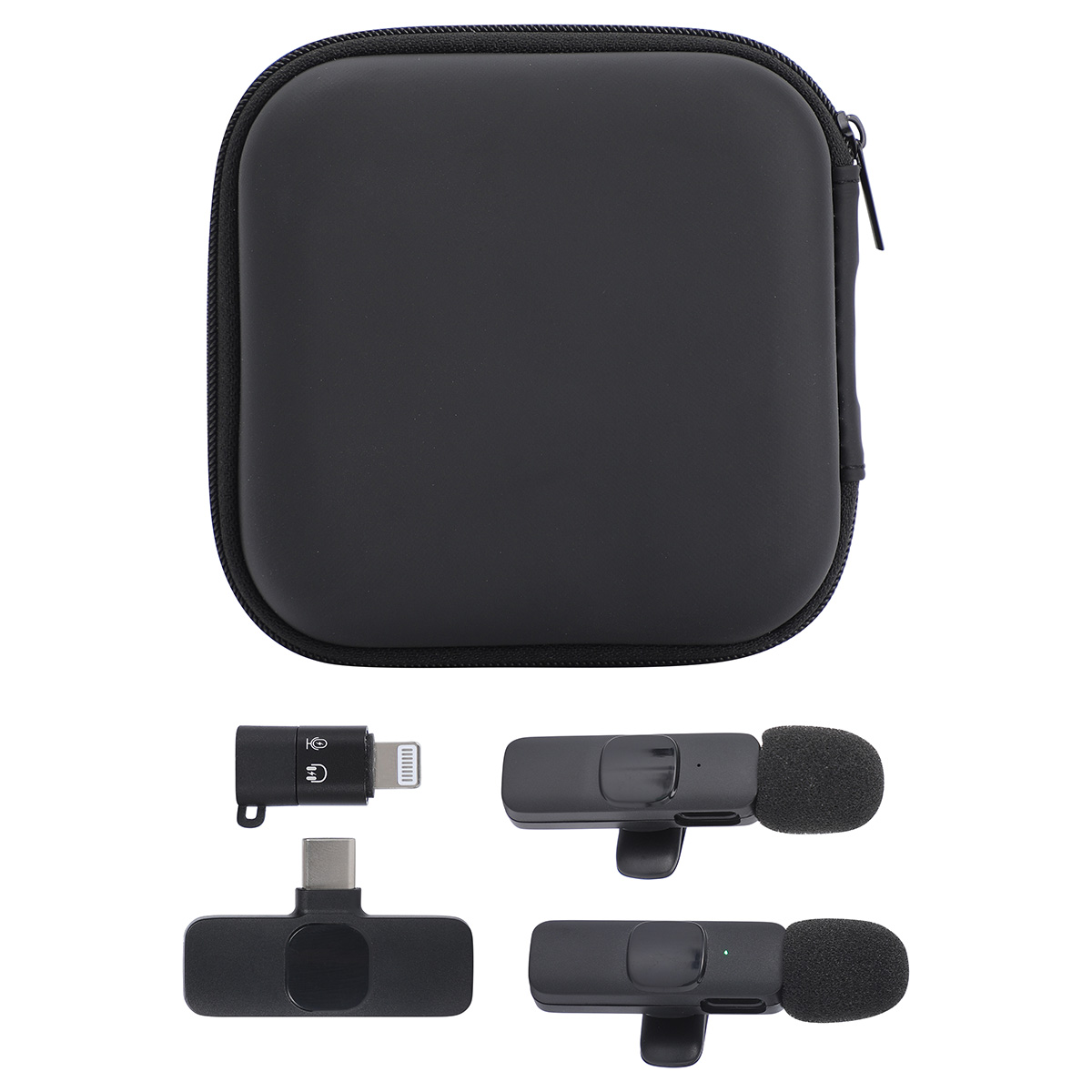 - Two microphones, one receiver & one connector in a zipper pouch