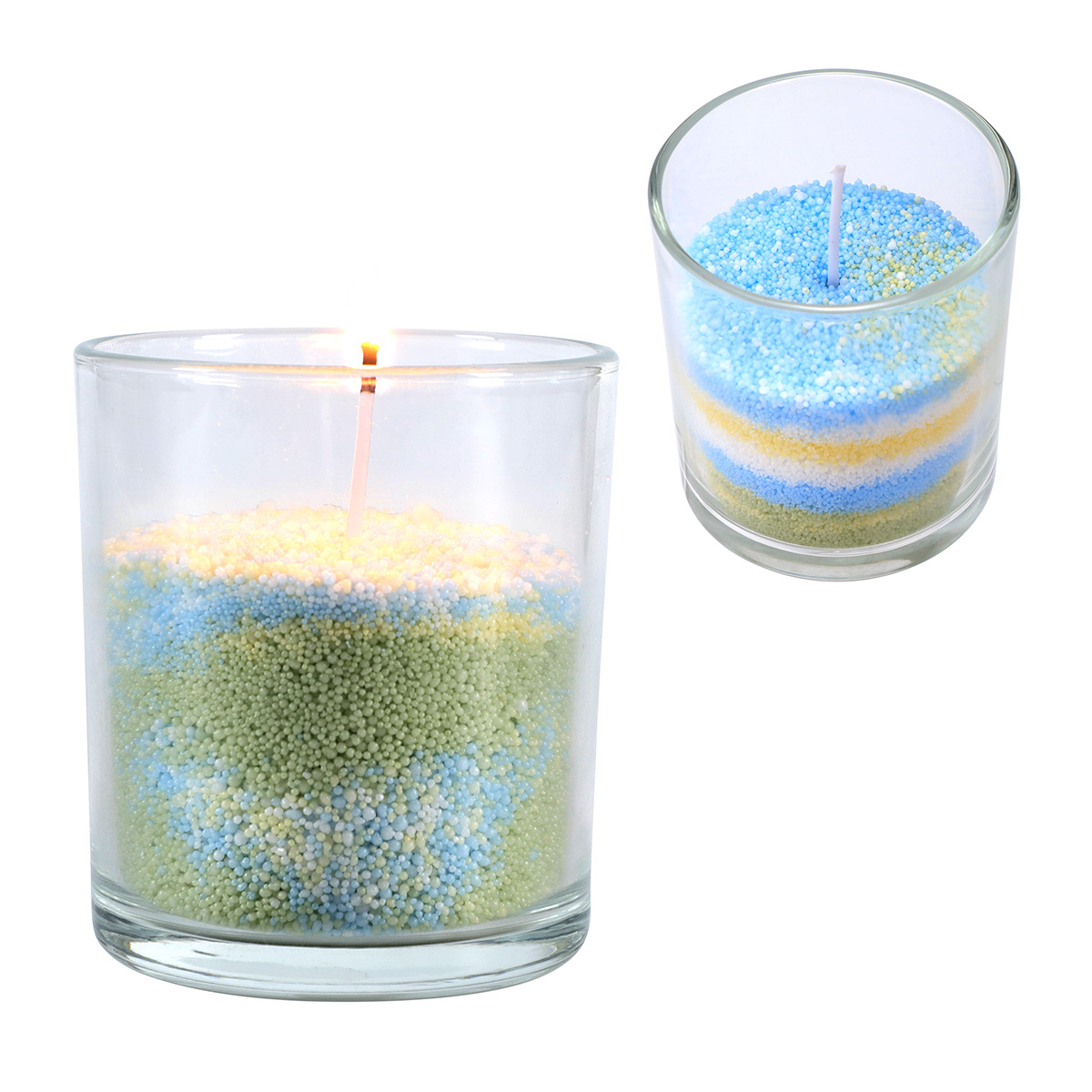 - Includes four colors of sand candle wax (3/4 oz per color / 3 oz total), a clear glass candle cup, and five cotton wicks for multiple creative designs