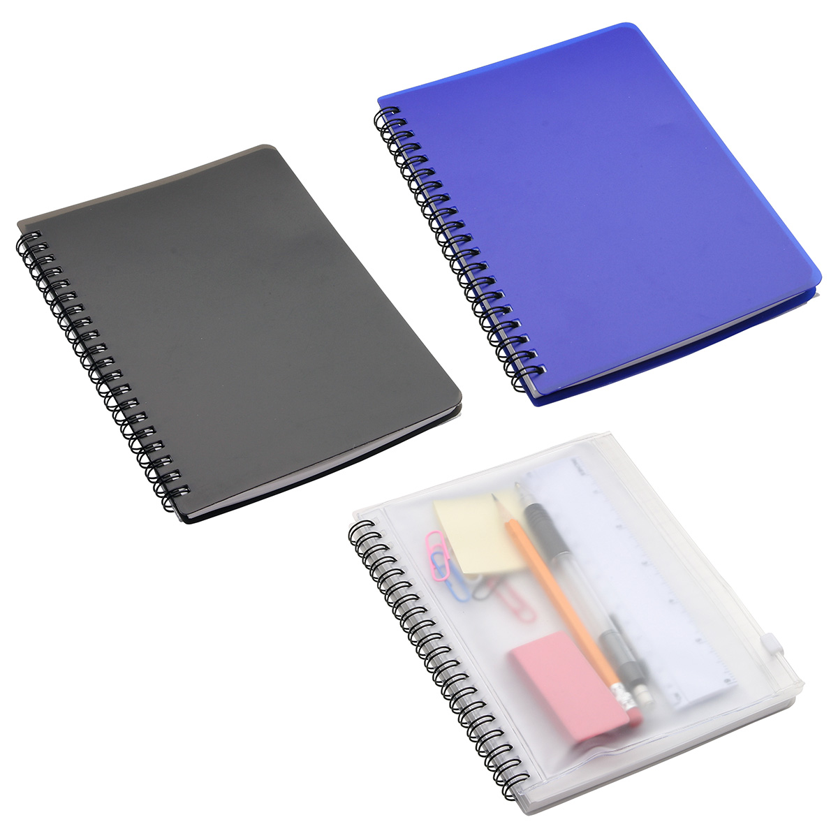 - Spiral-bound translucent vinyl notebook