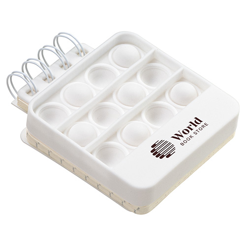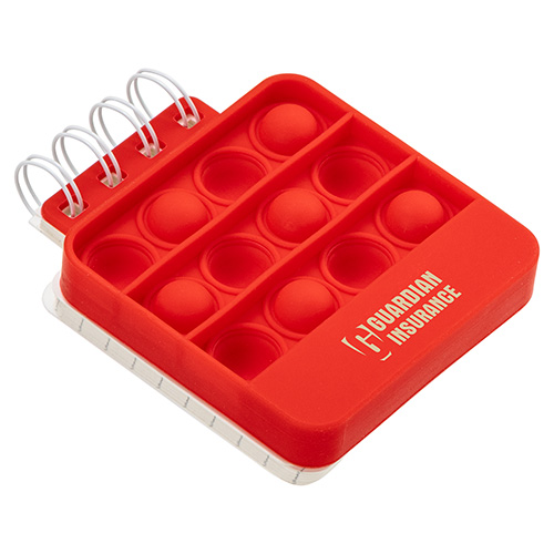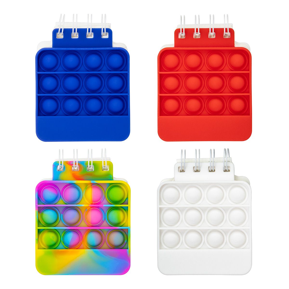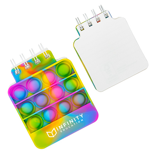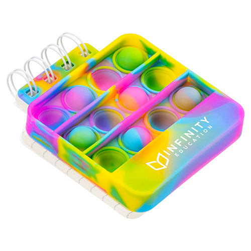 - Square-shaped spiral notebook with built-in push pop fidget cover