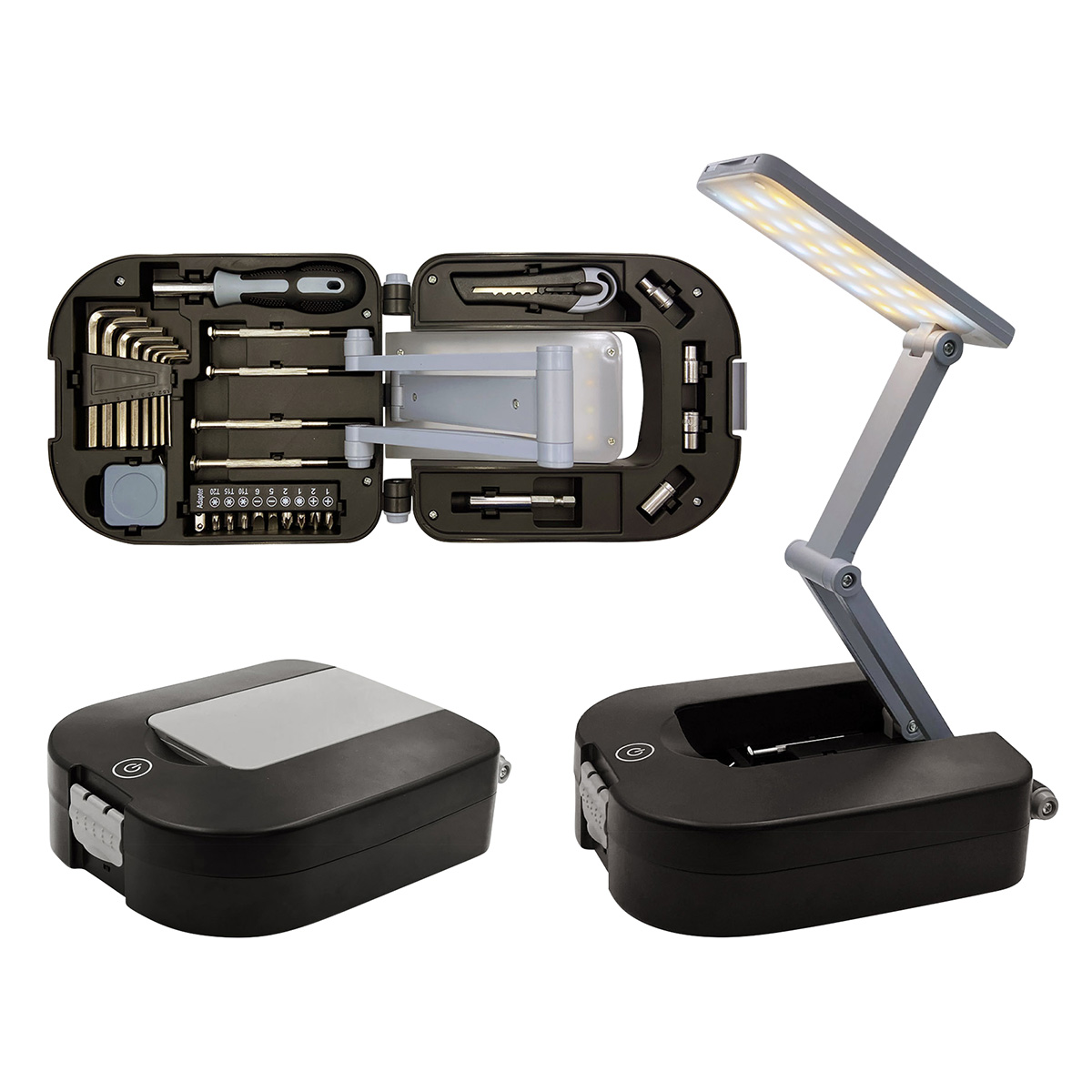 - Multifunctional 30-piece tool kit with integrated retractable LED worklight
